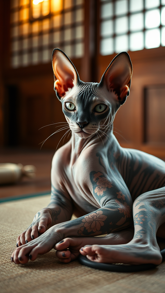 Capture an image of a hairless sphinx cat with striking colorful irezumi tattoos, lounging confidently in a traditional Japanese room. The scene is illuminated by a soft, warm light that highlights the intricate details of the tattoos. The photograph should be taken with a medium format camera, ensuring a rich and vivid portrayal of the setting and the cat's unique appearance.