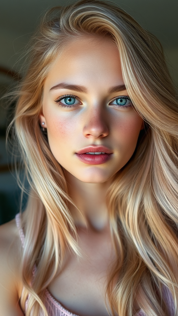 Capture an image of a striking young woman with captivating light blue eyes and flowing hair in a blend of soft blonde and subtle pink hues. Set indoors, the portrait should embrace the charm of natural lighting, enhanced by a gentle play of shadows and authentic film grain texture. Add a touch of creativity with a hint of freckles across her cheeks, lending an air of whimsical realism to her ethereal beauty.