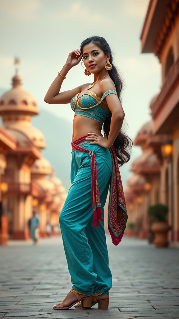 Capture an image of Liza Soberano channeling Jasmine from Aladdin with a distinctive full-body pose, dressed in Jasmine's iconic turquoise pants and cropped top outfit. Position her slightly below eye level to convey strength and confidence, placing her off-center to the right to create an open and free atmosphere with empty space on the left. Embrace soft, diffused lighting with vivid, bright colors and a carefully balanced contrast to highlight intricate patterns. Employ a shallow depth of field to blur the background, while using a slightly skewed upward angle for the perspective, lending a sense of heightened empowerment. Capture the essence of confidence and empowerment with a cinematic and contemporary style that accentuates the photograph’s details. Set the backdrop as the enchanting city of Agrabah, enhanced with a subtle vignetting effect and slightly desaturated colors with increased contrast for a vintage, nostalgic touch. Texture is meticulously captured using a Nikon D850 and a 24-70mm f/2.8 lens, at settings of 1/125 sec, f/5.6, and ISO 200, incorporating slight artistic alterations to maintain the core essence.