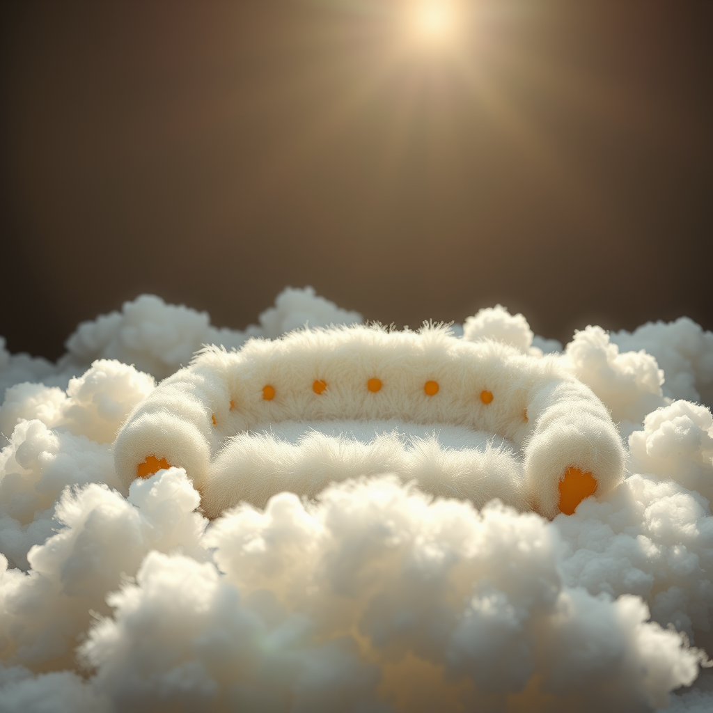Capture an innovative and creative photography scene featuring a small fluffy couch inspired by clouds, with subtle yellow material accents. The image should reflect the pinnacle of productive photography using a Sony α7R IV camera and a Sony FE 24-70mm f/2.8 GM lens. Set the aperture to f/8 to achieve exceptional sharpness, and use a shutter speed of 1/125 to perfectly freeze the moment. Maintain an ISO of 100 to ensure the finest image quality, highlighting every detail from intricate light patterns to the rich textures of materials. Illuminate the scene with realistic sunlight, enhancing contrast and casting a sharp, cinematic focus. The background should be solid, presenting an editorial glamour with a 16K resolution for rich, vivid details. Ensure the shoot embodies a touch of personalization and style, maintaining a raw essence yet achieving a refined editorial appearance.