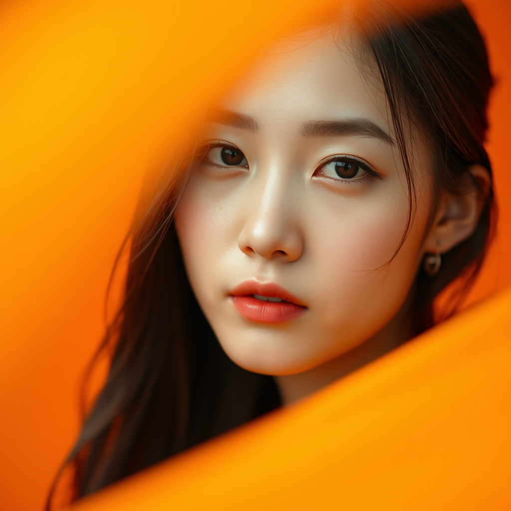 Capture an intimate portrait of a Korean woman model against a solid orange backdrop, enveloped in a warm orange hue. Utilize a camera setup that simulates a large aperture, such as f/1.4, to achieve a beautifully blurred background and a soft focus on the model, creating a raw and authentic aesthetic. The composition should emphasize the model's serene expression and the vibrant, cohesive warmth of the scene.