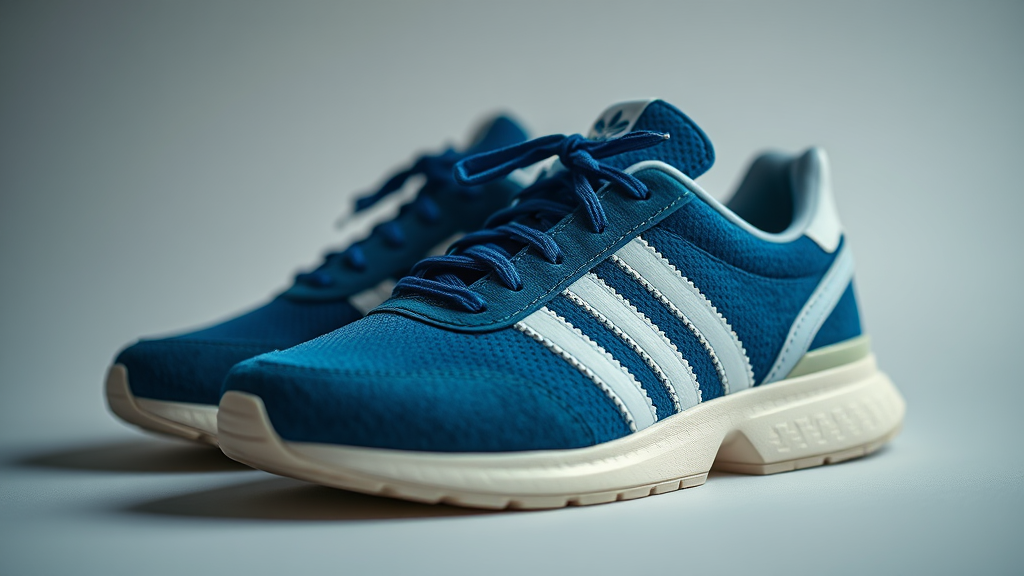 Capture an ultra-high definition close-up photograph of Adidas blue suede sneakers with white accents, emphasizing texture and detail. Utilize a Sony A7R IV camera paired with a FE 50mm f/1.2 GM lens to achieve a beautifully blurred background, set against a solid white backdrop. The image should exhibit a realistic light setting with enhanced contrast and hyper-realistic resolution, showcasing every intricate detail of the sneakers. The aspect ratio should be 9:16, maintaining a raw, authentic style while incorporating a subtle artistic flair for added visual appeal.