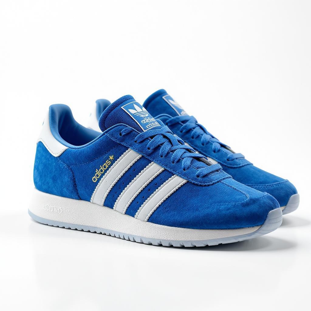 View this AI-generated image featuring capture an ultra high definition and hyper realistic close up photograph of adidas blue suede sneakers with white accents use the sony a7r iv camera paired with a fe 50mm f 1 2 gm lens focusing to create an exquisite depth of field against a solid white backgro