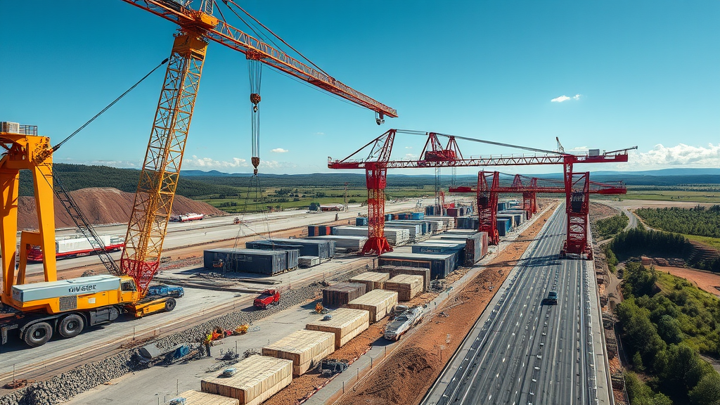 Capture detailed photographs of the bustling construction site of the dry port in Drogobich, highlighting the advanced machinery and skilled workers in action as they lay the foundation and erect steel structures. Emphasize the dynamism and scale of the project by showcasing cranes lifting heavy materials, workers collaborating efficiently in safety gear, and the intricate network of newly paved logistic pathways. Incorporate a backdrop of lush landscapes and clear blue skies to add contrast and vibrancy, illustrating the balance between industrial progress and natural surroundings, capturing the essence of innovation driving economic growth in the region.