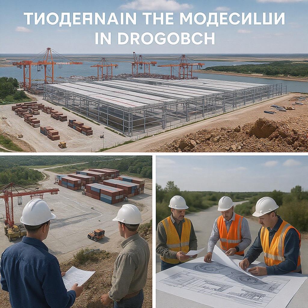 Capture detailed photographs of the ongoing development of the modern dry port in Drogobich for a business presentation, featuring bustling construction sites with cranes lifting containers, workers overseeing logistics operations, and engineers inspecting blueprints, set against a backdrop of partially completed infrastructure and surrounding natural landscape.