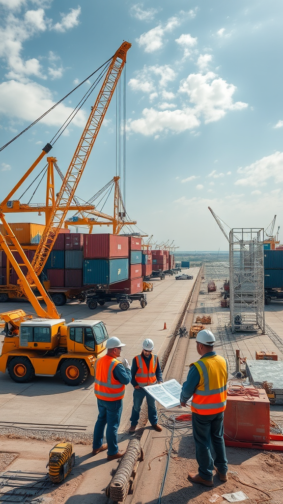 Capture dynamic photographs of the ongoing construction of the dry port in Drogobich, showcasing workers and machinery actively engaged in building the infrastructure. Highlight the vastness of the site with wide-angle shots, focusing on the modern design elements and the integration of innovative construction techniques. Include images of cranes lifting large shipping containers, engineers examining blueprints, and the developing logistics facilities, emphasizing the project's scale and potential economic impact on the region. The photographs should convey a sense of progress, collaboration, and forward-thinking development.
