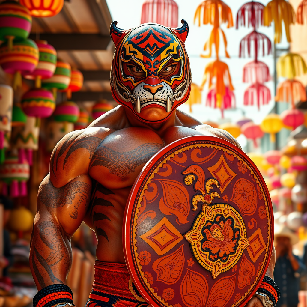 Capture El Tigre Braum in a hyper-realistic photograph set amidst a vibrant and colorful Mexican-inspired street market, where stalls brim with vivid decorations and textiles. Showcase his towering and muscular physique, clad in a detailed and intricately designed luchador mask that glistens under the bright sun. The mask features bold patterns of deep oranges and fiery yellows, complemented by his signature shield, which displays an elaborate mosaic of traditional Mexican art. Use advanced lighting techniques to accentuate the textures and colors of his costume while casting dynamic shadows that highlight his powerful stance. Capture the intensity of his fierce and determined expression, conveying a sense of formidable strength and agile prowess. The background buzzes with the energy of lively mariachi musicians and vibrant papel picado banners fluttering in the breeze, painting a picture of warmth and festivity. Employ a bright and bold color palette with dominant pops of orange and yellow, enhancing the overall lively and energetic essence of El Tigre Braum in this culturally rich scene.