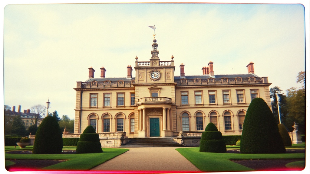 Capture the whimsical essence of a UK palace through the lens of vintage disposable photography, with a soft, ethereal atmosphere and a touch of nostalgic charm, evoking a fairytale-like dreamscape in a 3:4 aspect ratio.