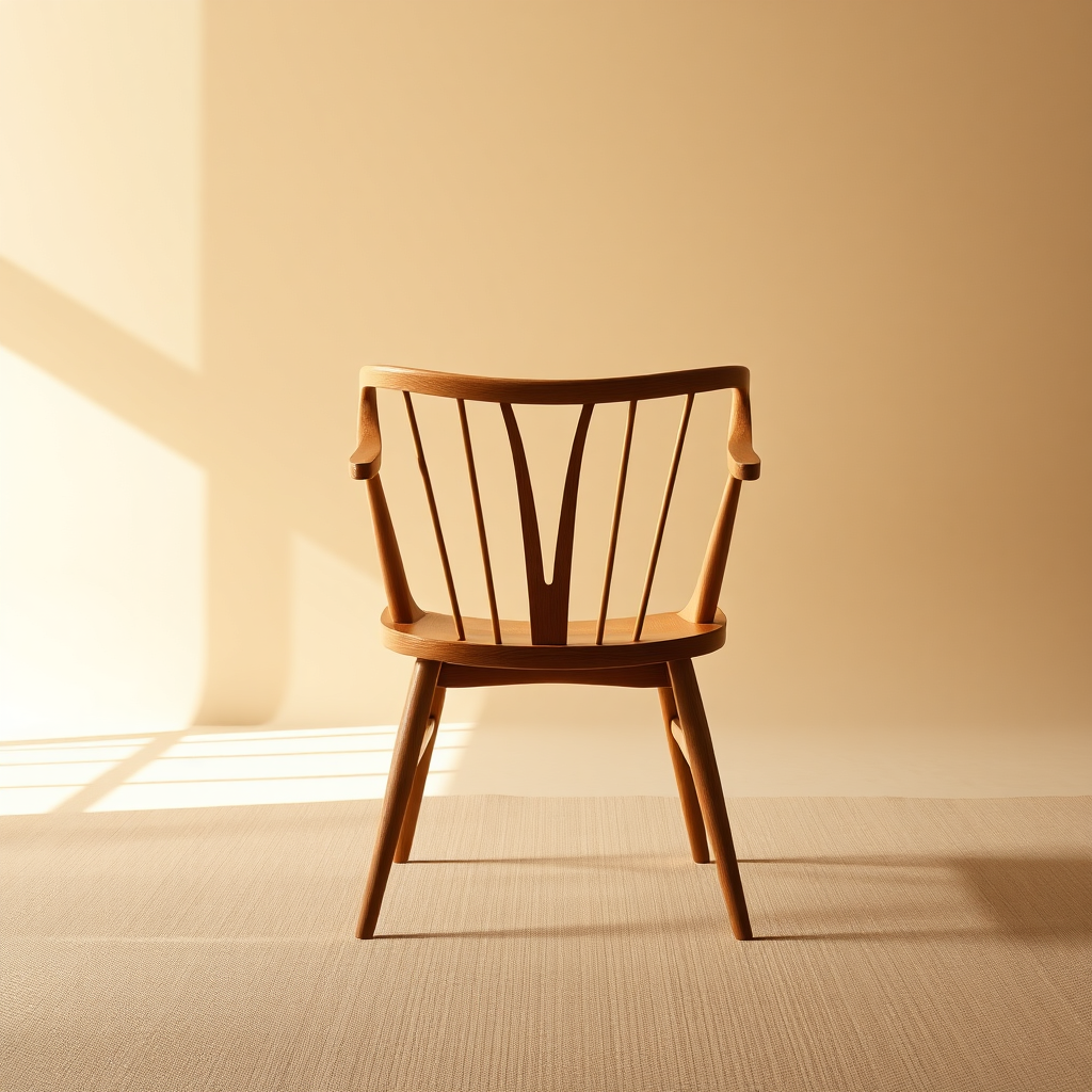 Capture a photorealistic image highlighting the timeless elegance of the Wegner Wishbone Chair, using a Leica Q2 with a fixed Summilux 28mm f/1.7 lens. Focus on the chair's iconic Y-back design and natural wood finish. Position the chair in a well-lit studio with a minimalist aesthetic, allowing the morning light to emphasize its curves and shadows. Set the backdrop in a subtle beige hue to complement the chair's warm tones. Shoot in 32K UHD resolution to showcase intricate details, ensuring the image communicates the chair's status as a cherished icon of modern interior design. Make slight creative adjustments while preserving the core essence.