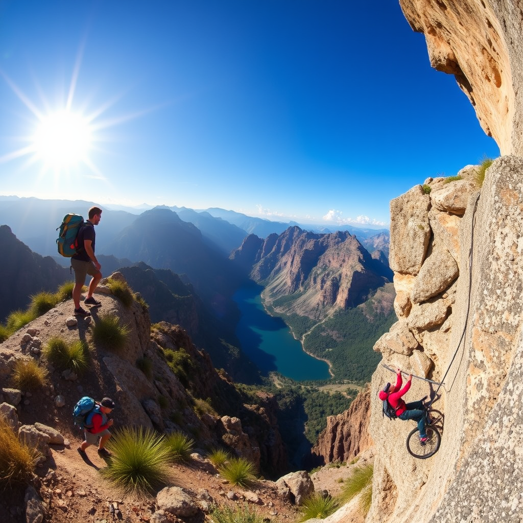 Capture images of a variety of outdoor adventures, like trekking, backpacking, trail biking, and cliff climbing, showcasing the thrill and allure of these activities in breathtaking natural environments using a versatile FE 24-105mm f/4 G OSS lens for outstanding image clarity, detail, and vibrant colors. Utilize camera settings with an aperture of f/5.6 for a balanced depth of field, an ISO of 200 for superior image quality, and a shutter speed of 1/250 sec to freeze the dynamic action and convey the energy of each moment.