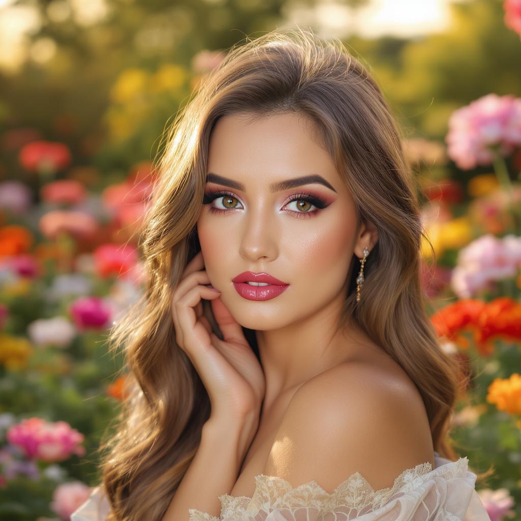 capture of a professional photoshoot in a vibrant flower garden during the soft glow of the morning sky, featuring a subject with strikingly detailed skin and a radiant complexion. they are posing gracefully, with a focus on their expressive and clear eyes, highlighted by detailed pupils. their makeup is subtle yet enhances their natural beauty, with a hint of blush on the cheeks and a touch of lipgloss. small earrings add a touch of elegance. the scene is captured with the highest quality, 8K resolution, with HDR for rich tones, and a bokeh effect that softly blurs the floral backdrop to emphasize the sharp focus on the subject. creative elements blend seamlessly to enrich the core essence of the setting, ensuring an image of exceptional clarity and allure.
