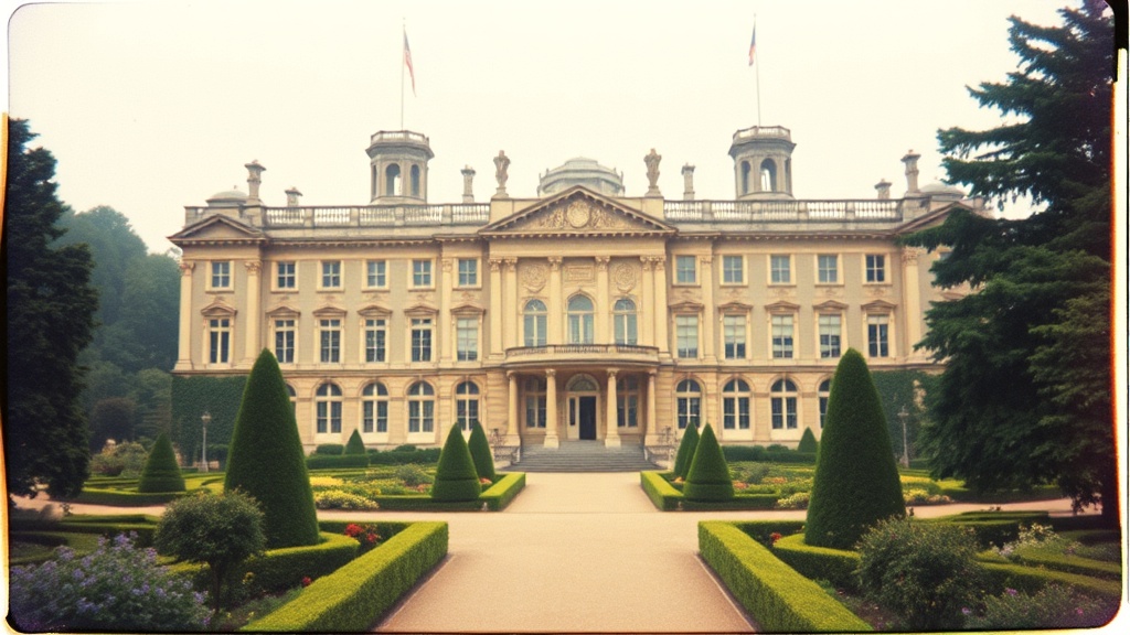 View this AI-generated image featuring capture the essence of a majestic uk palace through the lens of a vintage disposable camera enveloped in a dreamy ethereal atmosphere framed in a classic 3 4 aspect ratio subtle soft focus and warm nostalgic hues enhance the timeless grandeur of the architectur
