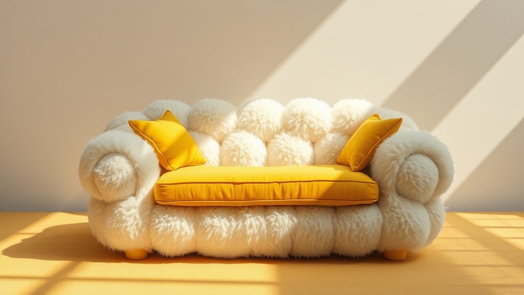 Capture an editorial-style photograph from a front view of a small, fluffy couch inspired by clouds, featuring yellow material details. Focus on its creative and innovative design using the Sony α7R IV camera, paired with a Sony FE 24-70mm f/2.8 GM lens. Set the aperture to f/8 for optimal sharpness, with a shutter speed of 1/125 to perfectly freeze the moment, maintaining an ISO of 100 for exceptional image quality. Ensure every detail, from the light patterns to the textures, is presented professionally. Utilize contrasting highlights with realistic sunlight, achieving a sharp focus and cinematic effect against a clean, solid background. Aim for a glamorous, rich detail akin to a high-fashion editorial shoot in 16K resolution.
