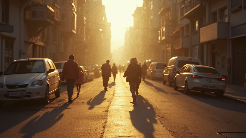 Capture the essence of urban streets bathed in soft, natural light, evoking a nostalgic film aesthetic where warm tones and gentle contrasts highlight the vibrant energy and everyday moments of the city.