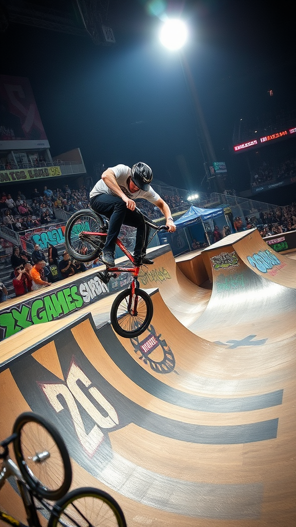 Capture the adrenaline-fueled action of a professional BMX rider navigating the intricate ramps and obstacles of an X-game park, showcasing their skill in sports photography. Emphasize the dynamic motion and intense focus required for each trick, highlighting the vibrant energy and wide dynamic range of the scene as the rider performs against a backdrop of graffiti and cheering crowds.