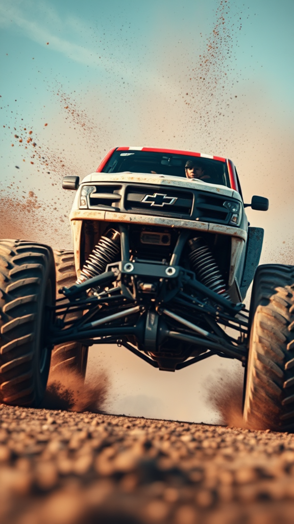Capture the adrenaline rush of a monster truck charging towards the lens, each detail of its rugged frame crisp against the blurred backdrop, showcasing the full spectrum of dynamic range and motion as dirt and debris fly through the air, embodying the raw power and excitement synonymous with extreme sports photography.