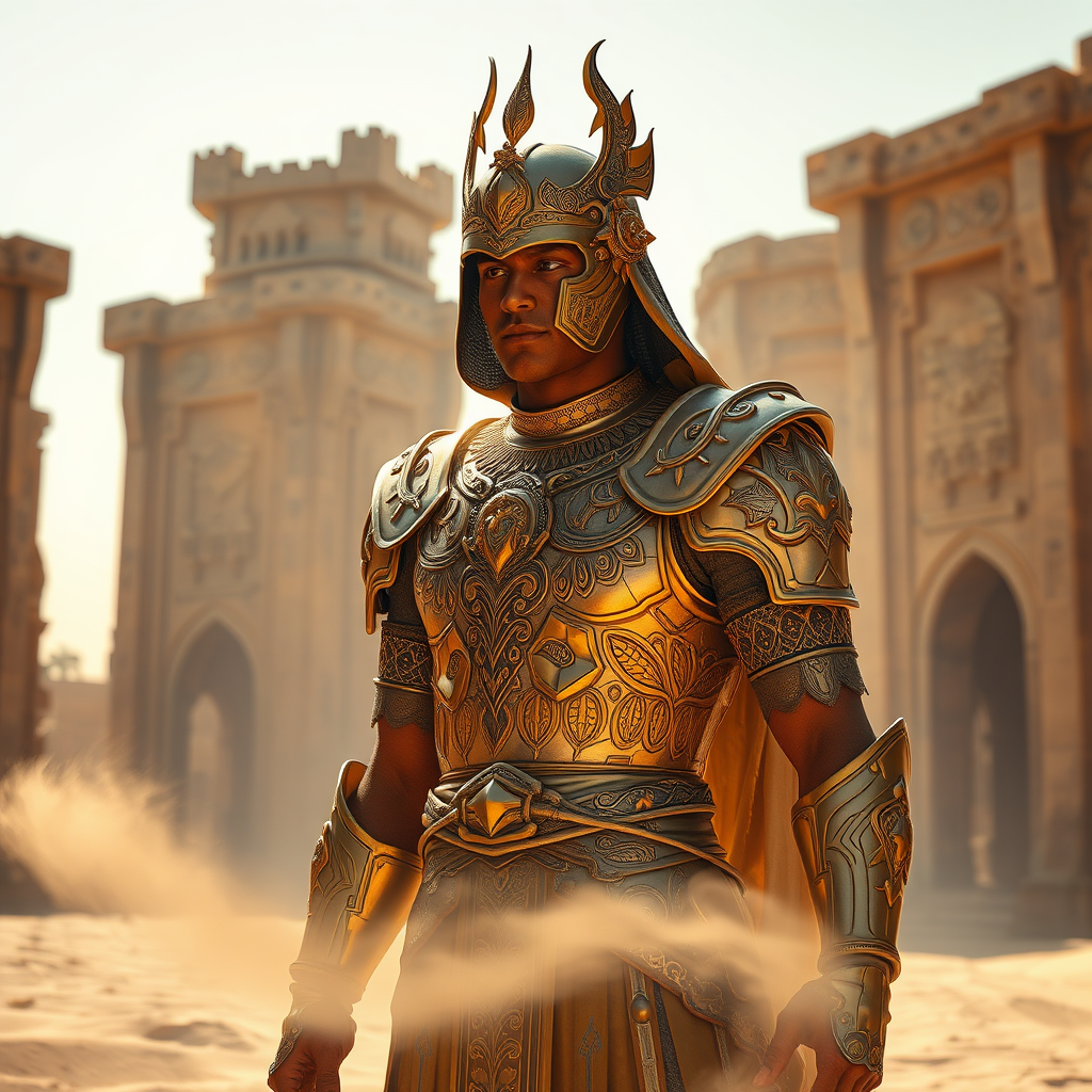 Capture the awe-inspiring presence of Original Azir in a hyper-realistic scene set within an ancient desert cityscape. Showcase Azir's intricately crafted golden armor, highlighting the delicate patterns of sand swirling around him. Utilize advanced lighting to create dramatic contrasts and enhance the depth of the scene, drawing attention to the intricate details of Azir's regalia. Surround him with towering sandstone structures, weathered by time yet standing strong under the ethereal desert light. Render each element with immersive realism, from the ornate embellishments of Azir's armor to the intricate textures of the sandstone, ensuring a vivid portrayal of power and majesty. Add subtle creative touches by introducing a gentle mirage effect in the distance and casting soft, dancing shadows that suggest the ever-shifting sands, all contributing to a breathtaking visual experience that encapsulates the grandeur and strength of Azir's presence.