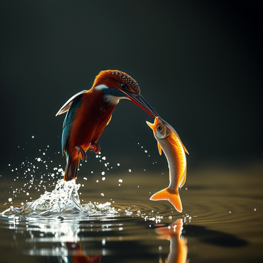 Capture the captivating moment of a stunning kingfisher as it deftly snatches a fish from the water, bathed in dramatic, cinematic lighting. The bird's vibrant red and blue feathers gleam against the backdrop, creating a breathtaking contrast. Shot with a 100mm lens, the scene is framed in a 4:3 aspect ratio, highlighting the intricate details and dynamic motion in exquisite clarity.
