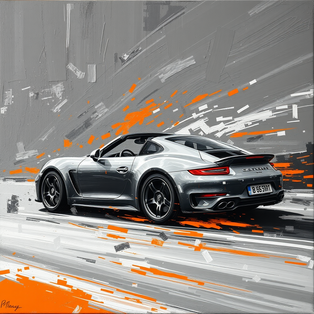 Capture the dynamic essence of motion akin to a speedster in a scene where time races forward. Employ the impasto technique with thick, textured strokes in oil paint for a tactile, dimensional finish. Anchor this piece in a contemporary setting, featuring a primarily monochromatic palette of deep grays and blacks, contrasted by vibrant bursts of orange and subtle highlights of white, creating a striking visual impact that emphasizes movement and energy.