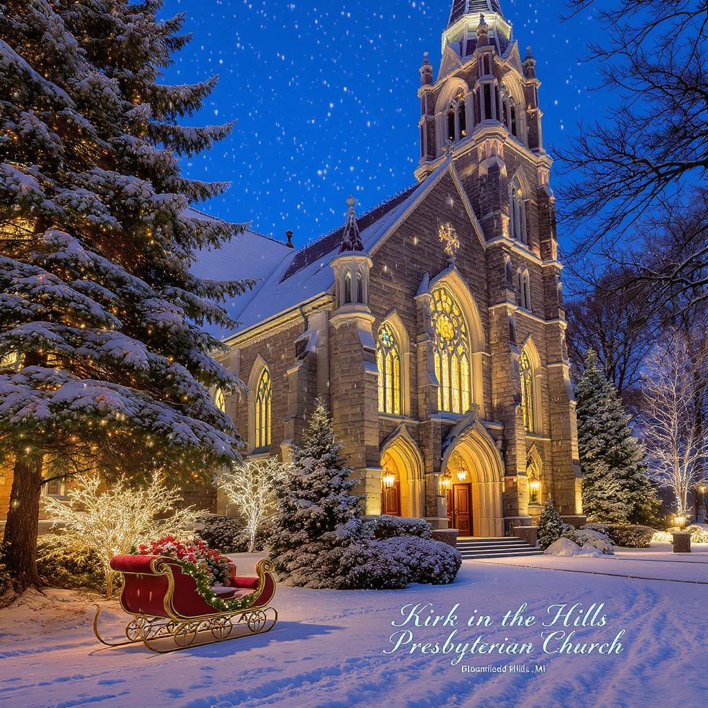Capture the enchanting spirit of the holiday season with a luxurious Christmas card showcasing the majestic exterior of Kirk in the Hills Presbyterian Church in Bloomfield Hills, MI. Envision the stunning Gothic architecture bathed in the soft glow of twinkling Christmas lights, with a gentle dusting of snow blanketing the grounds and the grand stonework. Towering evergreen trees, artfully adorned with shimmering ornaments, frame the scene, and a warm golden light spills from the church windows, casting welcoming shadows on the snow-covered path. A vintage-style sleigh, nestled by the entrance and filled with festive garlands and holly, adds a touch of rustic charm. The serene winter landscape and the quiet dignity of the church invite a sense of peace and awe, perfect for celebrating the wonder of the season.