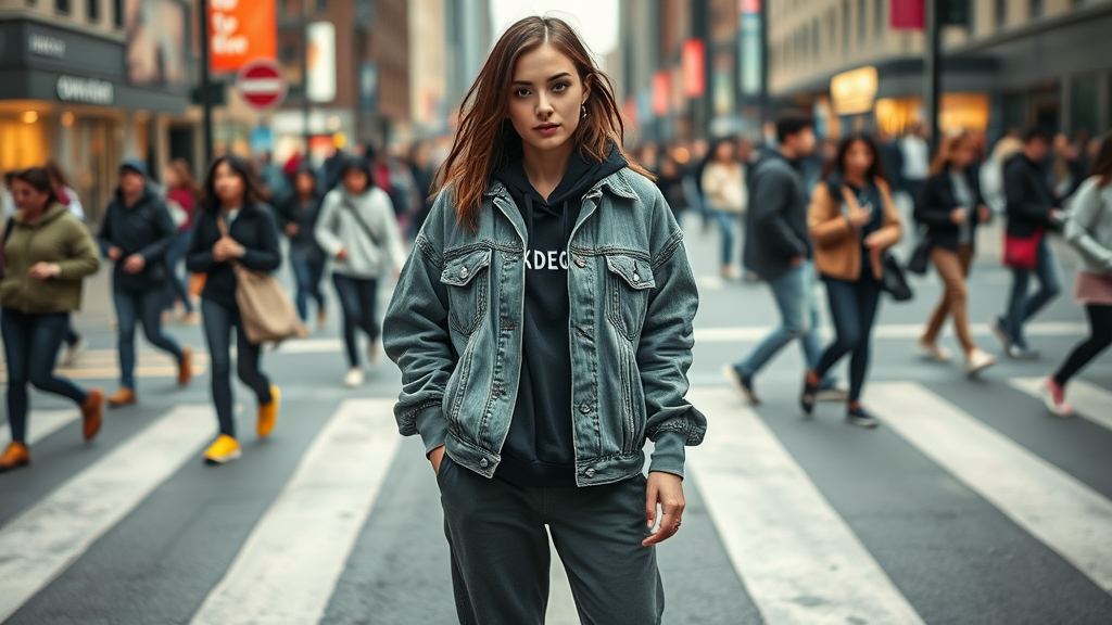 Capture the essence of a 28-year-old professional model in a natural pose on a bustling street crosswalk. She wears a garment-dyed, loose-fit trucker jacket with a subtle text logo, layered over a black hoodie, paired with jogger pants, and the vibrant yellow Yeezy Boost 350 sneakers. Using a Canon EOS-1D Mark III, the focus is set on the intricate details and form of her outfit, amidst a backdrop teeming with passers-by. The shot employs prolonged exposure for a photorealistic feel, aiming for raw and authentic realism. Elements of surrealism emerge with unusual shapes and peculiar details, such as extra limbs and unconventional facial features, echoing celebrity-like familiarity. The image includes intriguing oddities like an unfinished form or a misplaced object while retaining an overall cohesive yet abstract visual narrative.