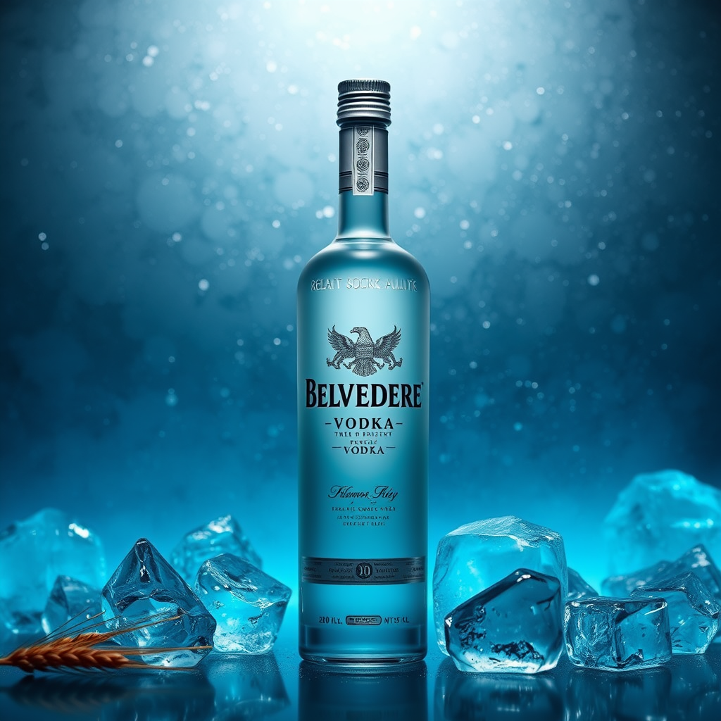 Capture the essence of a luxurious Belvedere Vodka ad campaign, featuring a bottle of the renowned vodka standing elegantly against a backdrop of frosted glass and shimmering ice. The scene is illuminated by a soft, ambient light that highlights the bottle's sleek design and the intricate details of its label. Surrounding the bottle are subtle hints of natural elements like wheat and water, reflecting the purity and craftsmanship of the vodka. The color palette should exude sophistication with tones of silver, white, and deep blue, creating a refined and inviting atmosphere that appeals to the discerning connoisseur. This composition embodies an air of exclusivity and elegance, while maintaining an approachable allure.
