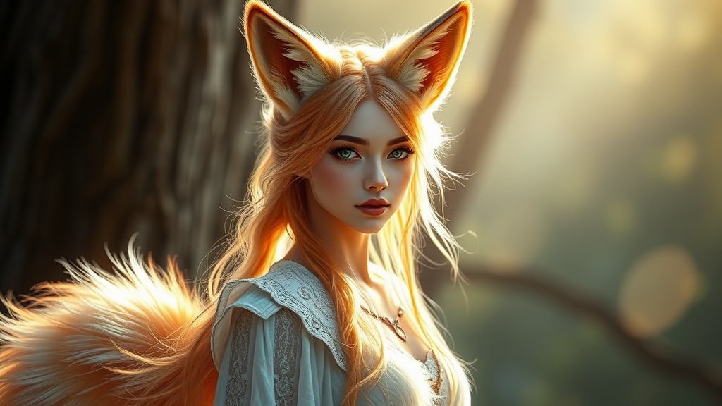 Capture the essence of a mystical nine-tailed fox girl, inspired by the styles of Wlop and Guweiz. She is rendered in hyper-realistic detail, as if photographed professionally in 8k resolution. The scene is bathed in soft, natural lighting that highlights her ethereal presence. While remaining true to the core concept, she exudes an aura of wisdom and enchantment, with her fur shimmering gently. Her eyes are expressive and captivating, drawing you into her world. The colors of her tails vary subtly, adding depth and intrigue to her appearance, creating a balance between fantasy and reality.