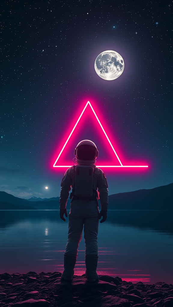 Capture the essence of a raw, highly detailed scene with the clarity of a Fujifilm XT3. An astronaut stands on the tranquil shore of a moonlit lake. The night sky is a canvas of stars, with an ethereal glow enhanced by ray tracing and 8k UHD quality. The scene is bathed in HDR, and the figure of the astronaut is partially silhouetted against a luminous, oversized neon triangle. The geometric shape floats mysteriously, casting shimmering reflections on the water's surface. The vibrant neon light adds a surreal touch to the serene natural landscape, creating a captivating blend of technology and nature.