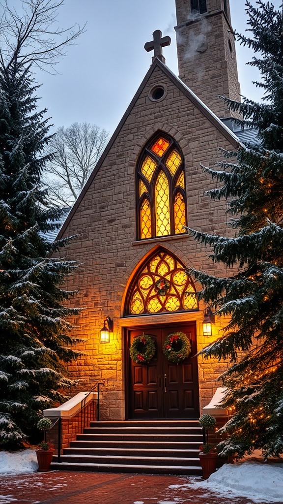 Capture the essence of a rustic luxurious Christmas scene by envisioning the historic Kirk in the Hills Presbyterian Church nestled in Bloomfield Hills, MI, dusted with a gentle snowfall. Picture the stone facade of the church warmly illuminated under a soft golden glow, with intricate stained glass windows subtly reflecting a spectrum of colors. The entrance is adorned with elegant wreaths made of deep green pine and rich red berries, exuding a festive charm. Majestic evergreens surround the church, their branches dusted with twinkling white lights, creating an enchanting winter wonderland. Smoke gently curls from the chimney, hinting at the warmth within, while the air is filled with the subtle scent of pine and cinnamon. The scene evokes a sense of timeless elegance, combining traditional holiday beauty with the serene grandeur of the church’s architecture.