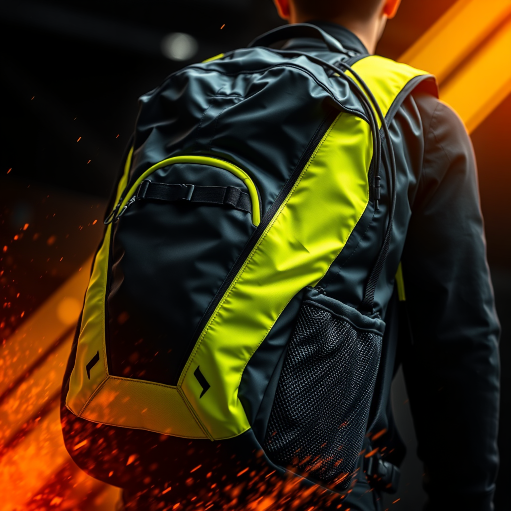 Capture the essence of a sleek, black and electric neon yellow urban sport backpack through dynamic and powerful composition, highlighting a high-octane, 4K visual with intricate and detailed textures. Infuse an air of adventure and vibrant energy, while maintaining a modern and sophisticated aesthetic.