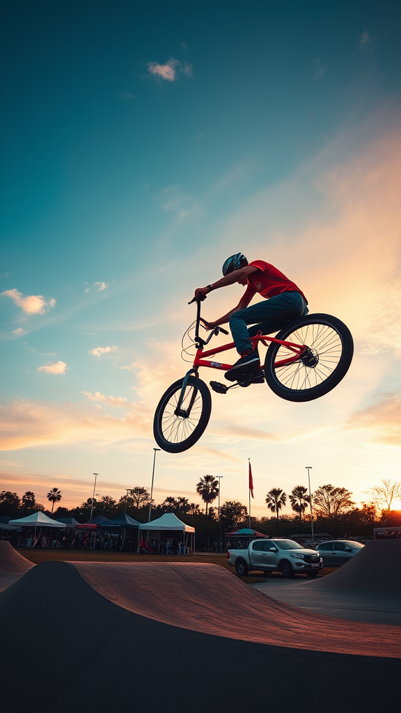 Capture the essence of action-packed sports photography with a focus on dynamic motion and wide dynamic range, set in an X-game park. Freeze the exhilarating moment as a professional BMX rider performs breathtaking stunts mid-air, the wheels spinning against a vibrant sky. The motion and intensity of the scene are enhanced through a tall aspect ratio to emphasize the rider's aerial prowess, bringing an artistic flair with a stylized twist.