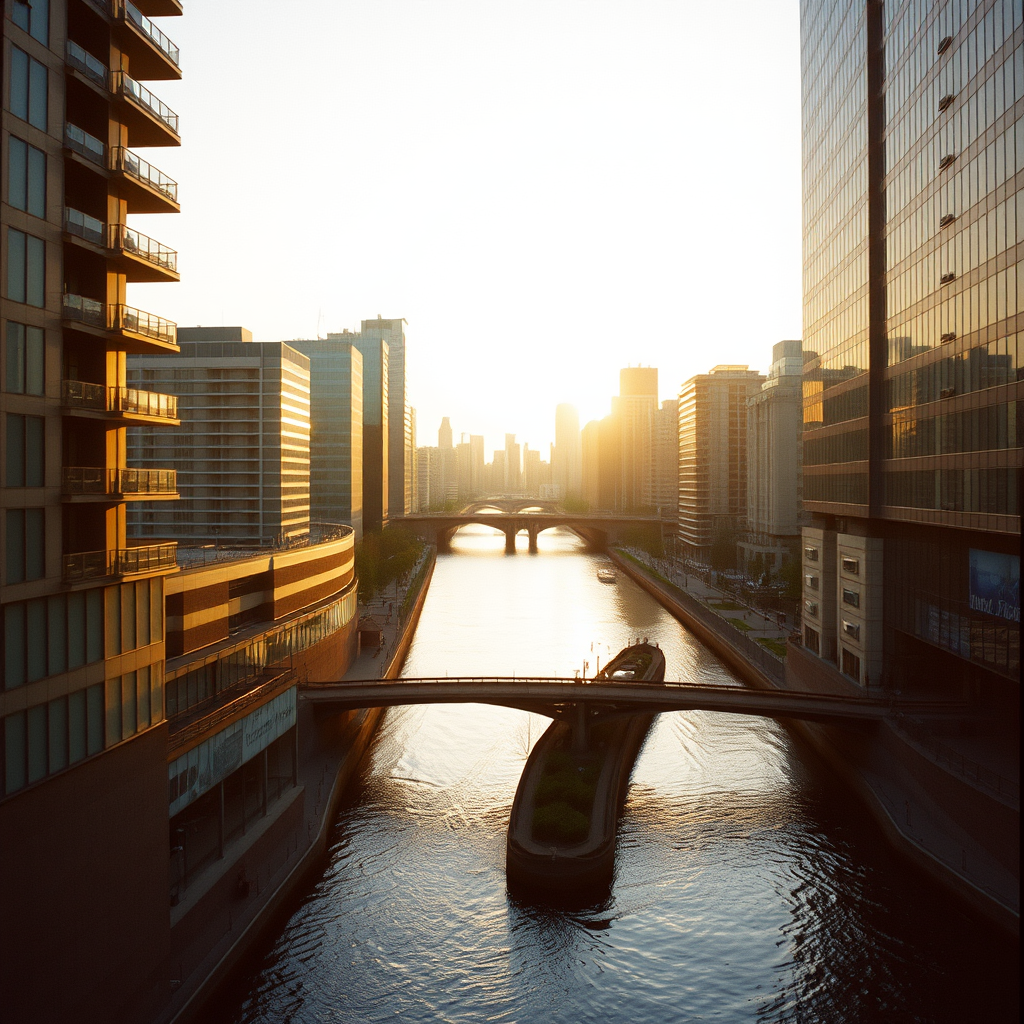 Capture the essence of an urban landscape with the warm, nostalgic tones of a Kodak Portra film photograph, focusing on a serene riverscape that weaves through the heart of the city, where modern architecture meets the gentle flow of water under a soft, golden sunset.