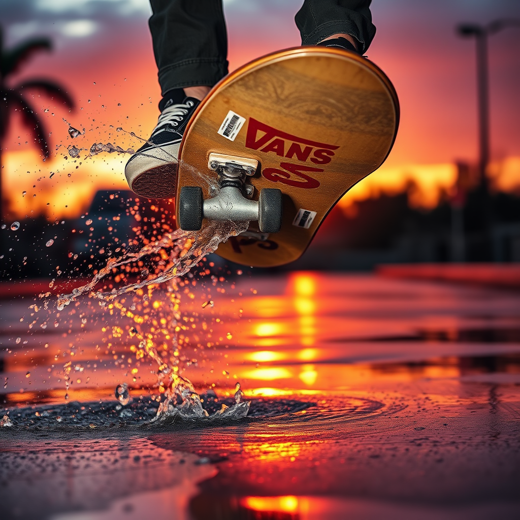 Capture the essence of dynamic, high-speed action amidst the warmth of a vibrant sunset. Focus tightly on the airborne skateboard and the soles of shoes, creating a dance of water droplets. In high-resolution photography, every brisk movement and subtle detail is preserved: water splashing, texture contrasts, sunset hues, and crisp details in both highlights and shadows. Utilizing a Nikon D850, known for its fast shutter speeds and high dynamic range, a NIKKOR 70-200mm f/2.8E FL ED VR lens perfectly isolates the subject with sharpness, freezing fast action with a creamy bokeh. A fast shutter speed of 1/4000 sec captures droplets in mid-air, while a low ISO minimizes noise. Focus on the skateboard's dynamic underside, adorned with gritty street art stickers, and the mid-flip shoes, black Vans Old School high-top sneakers, gripping the board's edge. The grip tape on the board bears witness to many rides. Set in an urban playground—likely a skate park or rain-slicked street—where reflective puddles mirror the fiery sky, the ground glistens with recent rain. In the background, city structures' silhouettes stand against a sunset gradient. The sun's dying light casts everything in rich amber, sharply defining silhouettes and making water droplets glitter like jewels. Every splash and ripple, the skateboard's underside texture, sneaker treads, and distant clouds sing with clarity. This high-contrast, vibrant end-of-day street scene melds nature's beauty with the raw energy of street sports, all elevated by dusk's dramatic lighting. UHD captures the essence of the moment in vivid detail.