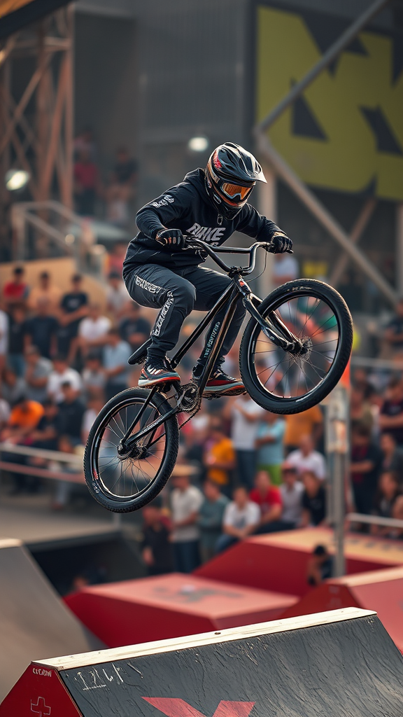 Capture the essence of photography in sports shooting, focusing on dynamic range and vibrant motion. Picture a professional BMX rider performing incredible stunts in the bustling atmosphere of an X-game park, with sleek angles and fluid motion. The scene is a vivid representation of athleticism and skill, set against the backdrop of a striking vertical composition, richly stylized to bring out the intense energy of the moment.
