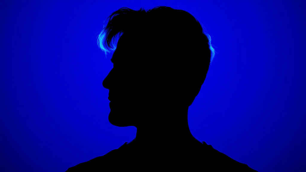 Capture the essence of photography with a frontal gaze portrait featuring a profile silhouette of a man set against a vibrant deep blue backdrop. The blue lighting highlights the contours of the face and hair, creating a dynamic interplay of light and shadow reminiscent of a color field painting. The subject, rendered in a deep blue, contrasts sharply against the monochrome background. Utilize a camera setup with a large aperture, like f/1.4, to achieve a shallow depth of field, focusing exclusively on the silhouette's edge. The result should be a photorealistic, ultra-high-definition image in a 9:16 aspect ratio, maintaining a raw style with a stylization level of 700, while allowing for slight creative variations that enrich the original concept.