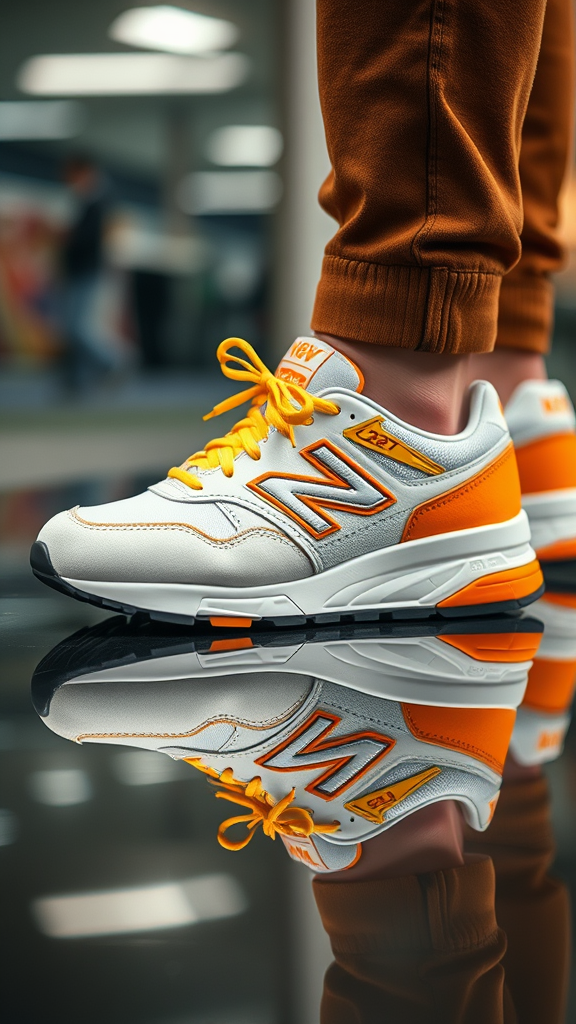 Capture the essence of productivity with a vivid photograph of New Balance 327 sneakers in white and orange, accented by a splash of vibrant yellow, their reflection mirrored on a shiny surface, creating a dynamic and energetic scene.