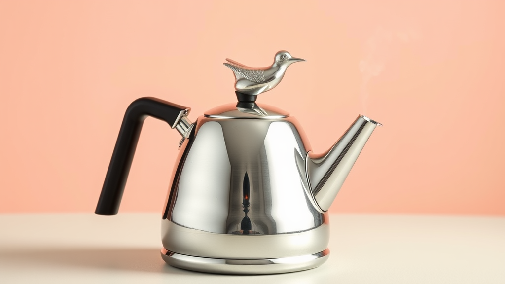 Capture the iconic Alessi Kettle featuring its playful bird whistle, using the Sony A7R IV paired with the Zeiss Batis 85mm f/1.8 lens. Highlight the kettle's gleaming reflective stainless steel surface and unique design against a gentle pastel background, illuminated with soft, diffused lighting to emphasize its artistic elegance. Add a subtle twist by introducing delicate steam rising from the spout, creating a sense of warmth and inviting charm.