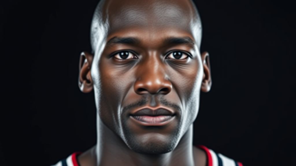 Capture the likeness of an iconic sports legend, featuring a portrait of Michael Jordan under studio lighting, utilizing 8k octane rendering for high-resolution photography. Emphasize the intricate details and sharpness, with the subject isolated against a solid black background. Aim for a refined, stock photo quality with expert color grading to highlight every fine detail, maintaining a recognizable yet artistically inspired representation. Photographed in portrait orientation at a 9:16 aspect ratio, showcasing unparalleled clarity and precision.