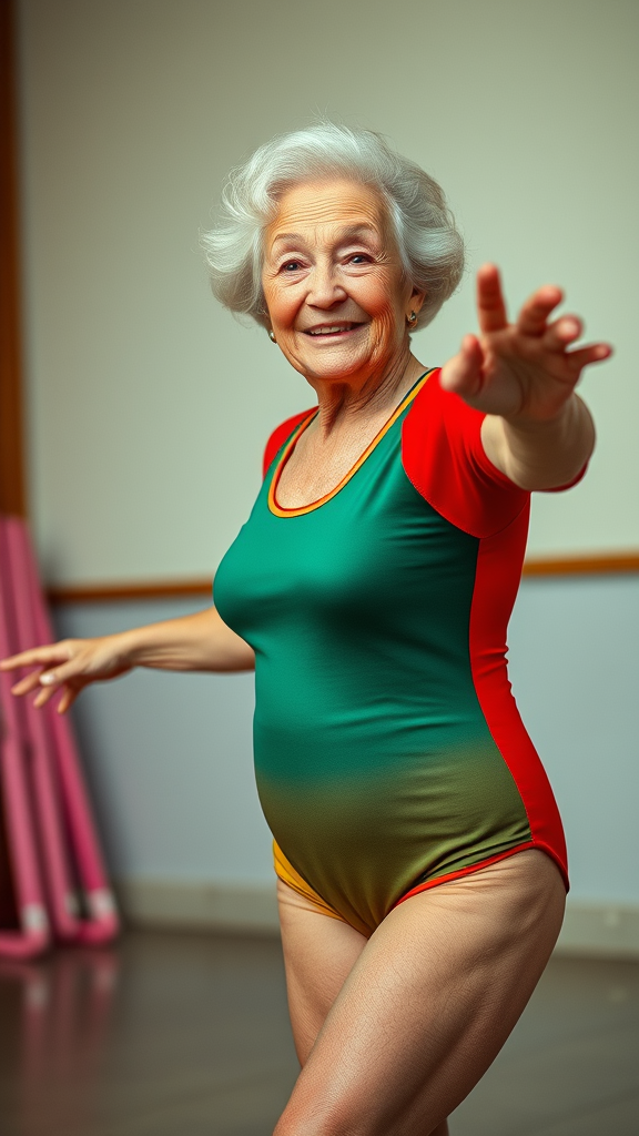 Capture the scene of an elderly woman, dressed in a colorful leotard, gracefully performing a plié. Her expression is humorously exaggerated, bringing a joyful energy to the moment. The focus should be sharp on her face, highlighting her symmetrical features and lively eyes. The wide-angle lens emphasizes the warmth and charm of the scene, creating a vivid image where the grandmother's playful spirit shines through.