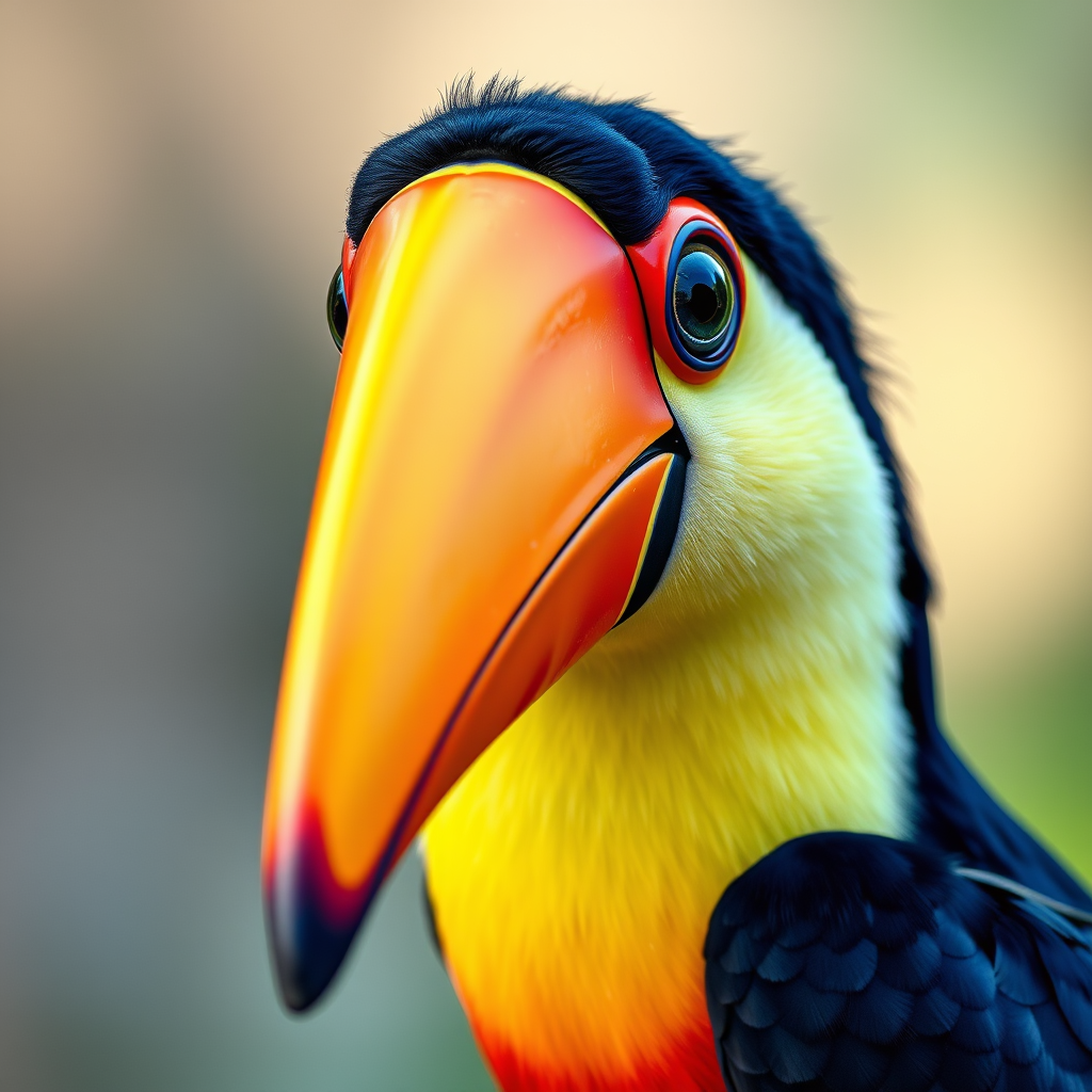 Capture the striking and exotic visage of a toucan, highlighting its vividly colorful beak and the inquisitive glint in its eyes, rendered in vivid colors with a focus on detail. This award-winning photograph, enhanced in ultra HD 8K, showcases the toucan in its natural splendor. The image should be free of noise, text, watermarks, human presence, blurring, and vector elements, presented in a seamless full portrait.