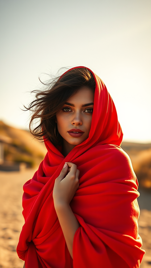 Capture the stunning Instagram fashion model posed elegantly in a crimson wrap, inspired by vibrant geometric artistry, reminiscent of Guy Aroch's style. Imagine a composition utilizing Unreal Engine 5 and the enchanting touch of Helene Knoop, featuring luminous pastel tones contrasted with defined bold lines and vivid colors. The scene is bathed in warm, sun-drenched hues, capturing the moment with the clarity and richness of a Fujifilm X-T4, paired with the precision of a Sony FE 85mm lens, resulting in an eye-catching vertical portrait.