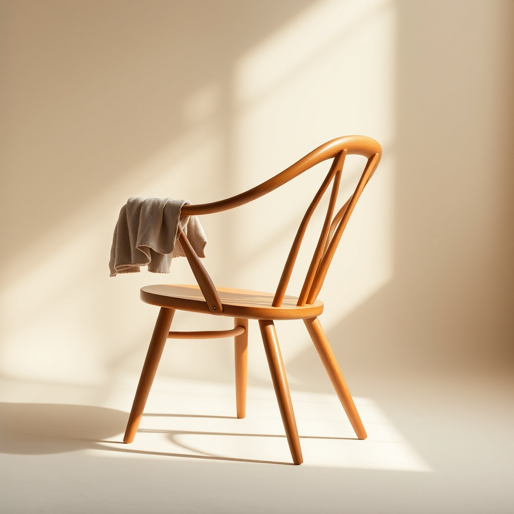 Capture the timeless elegance of the Wegner Wishbone Chair using a Leica Q2 with a Summilux 28mm f/1.7 lens, highlighting its iconic Y-back design and natural wood finish. Place the chair in a minimalist, well-lit studio where soft morning light accentuates its graceful curves and shadows. The backdrop should be a subtle beige, complementing the chair's warm tones. Render the image in 32K UHD resolution, showcasing intricate details that underscore the chair's status as a beloved staple of modern interior design. Introduce slight creative modifications, such as adding a delicate, folded linen draped over the armrest, enhancing the chair's inviting nature while retaining its core elegance.