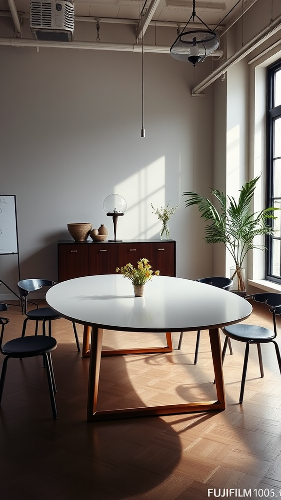 Capture the USM Haller Table in a sophisticated photo studio setting, utilizing the Fujifilm GFX 100S with the GF 80mm f/1.7 lens; emphasize the table's graceful simplicity and polished design, set against an ambiance that highlights its pristine lines and minimalistic elegance.