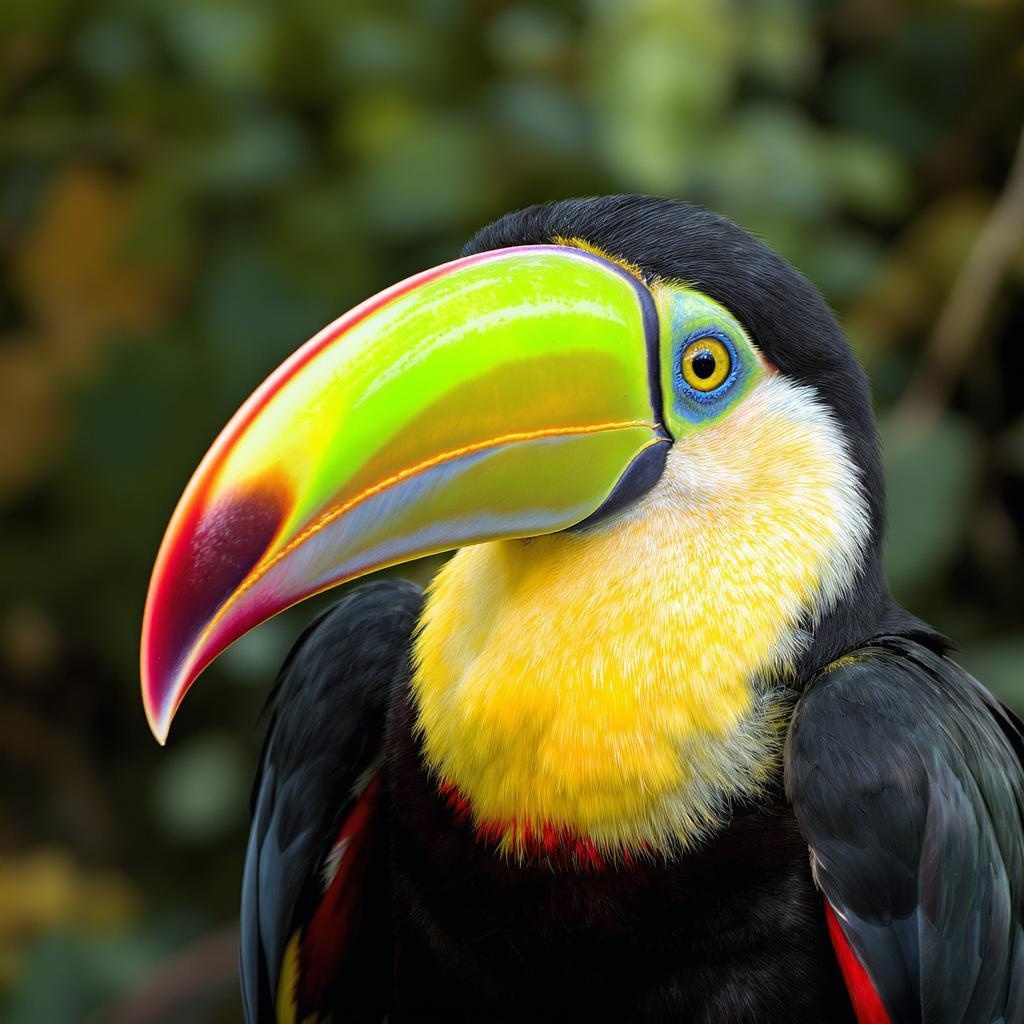 Capture the vivid and exotic essence of a toucan, emphasizing its brilliantly colorful beak and the inquisitive glint in its eyes, vibrant hues in ultra HD 8K clarity, showcasing an award-winning photographer's mastery, with exquisite detail, seamless and noise-free finish, devoid of any watermarks, text overlays, humans, people, blur, or vector elements.