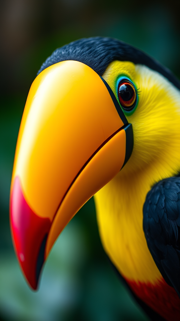 Capture the vivid and exotic portrait of a toucan, emphasizing its strikingly colorful beak and curious eyes. The image should be in ultra HD 8K resolution, showcasing vivid colors and intricate details. The composition should focus solely on the toucan, free from noise, watermarks, text, people, or any blurring, preserving the natural essence of this award-winning photograph.