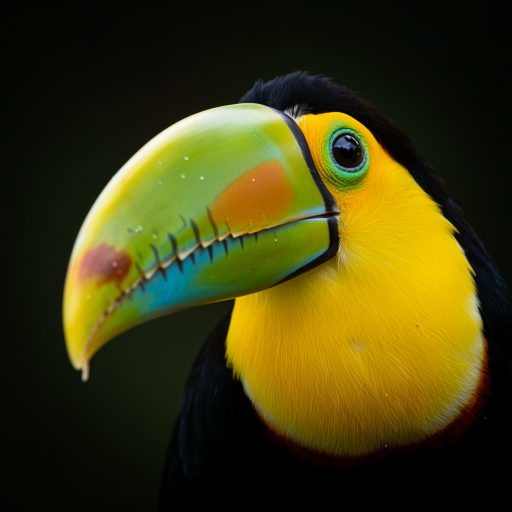 Capture the vivid and striking face of a toucan, emphasizing its brilliantly colorful beak and the inquisitive sparkle in its eyes, rendered in vibrant, ultra-detailed 8K quality as if seen through the lens of an award-winning photographer, enhanced to perfection in Photoshop without noise, ensuring a clear, colorful image free from watermarks, text, cropping, human elements, blur, or vector effects.