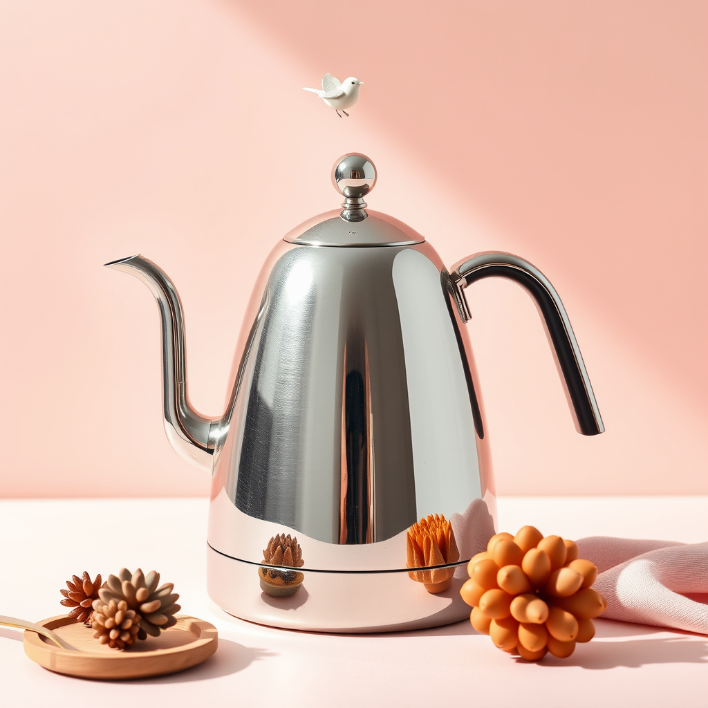 Capture the whimsical charm of an Alessi Kettle featuring a bird whistle against a soft, pastel background. Utilize a Sony A7R IV paired with a Zeiss Batis 85mm f/1.8 lens to highlight the kettle's reflective stainless steel surface, emphasizing its playful design. Ensure the lighting is diffused to create a gentle and inviting atmosphere. Add a few subtle, creative elements that enhance the visual narrative while maintaining the focal point on the kettle's unique features.