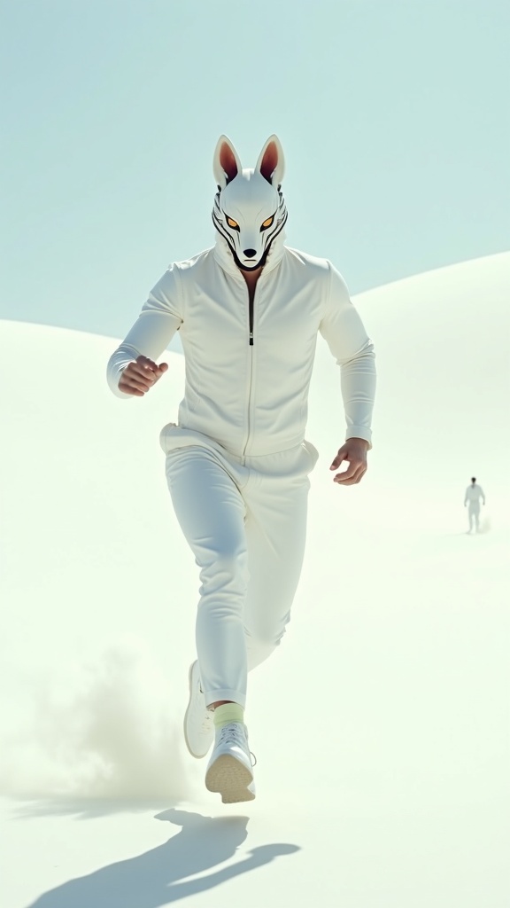View this AI-generated image featuring a man is captured in a dynamic pose as he runs towards the camera sprinting across a vast expanse of white sandy dunes in the desert his face is concealed by a striking kitsune mask and his attire mirrors the mythical kitsune with white face paint and intricate