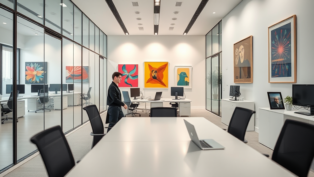 Capturing a candid moment within a minimalist office space, the environment boasts an ergonomic design accentuated by expansive glass walls and sleek lines. A neutral color scheme sets a calm backdrop, highlighting vibrant art pieces that inject bursts of color. Studio lighting gently illuminates the scene, creating a harmonious blend of functionality and creativity in this thoughtfully designed workspace.