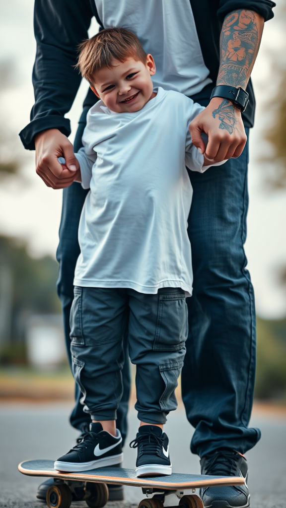 Capturing the essence of a candid moment, a young boy beams with a wide grin as he stands confidently on a skateboard, expressing a playful yet cool vibe in his loose-fit white T-shirt and dark grey cargo joggers. He holds onto the strong, tattoo-adorned hands of an adult, whose visible lower half is clothed in black loose-fit long sleeves. Both wear Nike SB skateboard shoes that highlight the contrast between new and comfortably worn. Their presence showcases perfect balance and a harmonious face-to-body ratio, enveloped in shared joy that bridges generations. The scene is set within the soft, natural light of a serene environment, captured through the lens of a Sony α9 II with a Sony FE 100-400mm f/4.5-5.6 GM OSS lens, resulting in a high-contrast effect.